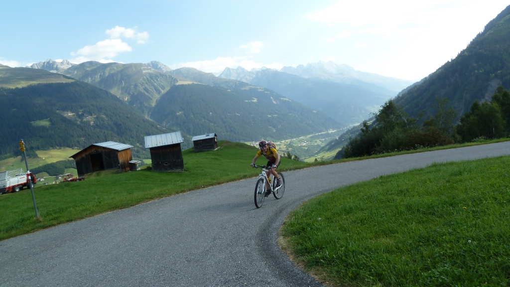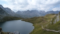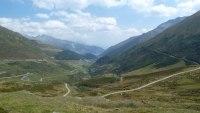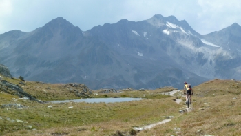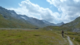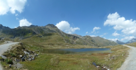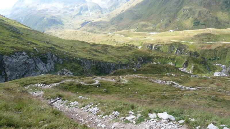 Place à la montée infernale. Depuis la vallée nous cheminons sur des pistes au milieu des alpages. Ensuite le parcours emprunte le col routier de l’Oberalpass. La végétation se fait rare et arrivé à 1800m nous bifurquons sur une piste gravillonnée. Les lacets nous conduisent vers une large vallée jalonnée de lac dans un paysage minéral. L’impression d’isolement s’accentue lorsque nous quittons la piste pour un minuscule sentier.