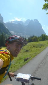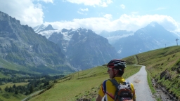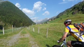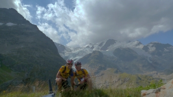 Petite pause sandwich et nous voilà partit pour la seconde et dernière ascension de l’étape :20 km et 1400de D+. Voilà pour les chiffres. La grimpette se fait uniquement sur bitume avec une circulation réduite voir interdite. Les premier lacets sur en forêt servent d’échauffement Jean mi place une attaque qui me laisse sur place. La route s’élève et nous apercevons les premiers glaciers : c’est magique.