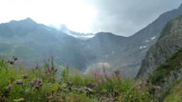 Je n’ose regarder le haut du col tant il semble loin et inaccessible. Rapidement la piste se rétrécit et la pente augmente, nous bataillons sur des sentiers en herbe l’effort est maximal. Je dérange un bébé marmotte qui court rejoindre son refuge.