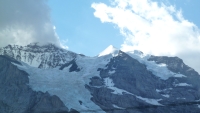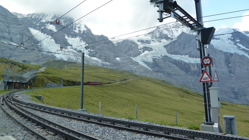 Les premières pentes de la Kleine Scheidegg nous rappellent la dure étape de la veille, les jambes sont en coton et les fessiers de plus en plus douloureux. Heureusement que la vue sur les glaciers est magnifique car le tracé est banal et la pente raide. Arrivée au sommet on regarde le petit (mais costaud) train rouge de la Jungfrau revenir du sommet : que ça doit être beau là haut…