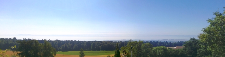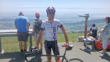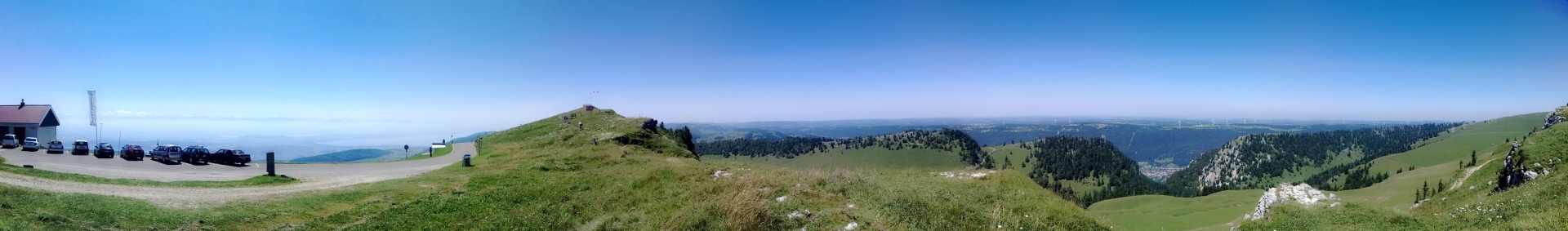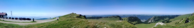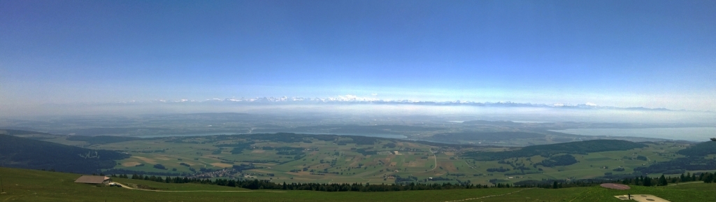 Puis arrive le sommet : c’est la claque ! Après avoir passé 1h dans les sapins et pâturages, au sommet la vue est exceptionnelle! L’horizon est découpé par la chaine des Alpes, du Mont Blanc (au sud) jusqu’à la Jungfrau (au nord) en dessous on aperçoit les nombreux lacs suisses. Comme une impression de voler. La douleur de la montée est oubliée en une vision : c’est ça gravir des cols.