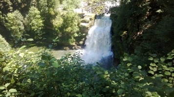 Retour en France, après un bon repas de midi à Villers le Lac, ma forme est plutôt bonne, je décide de faire un détour par le saut du Doubs. On peut y accéder en vélo, mais c’est assez enclavé, donc une bonne descente/montée à la clé. Le Doubs se rétrécit a cet endroit et passe dans un éperon rocheux, pour finir par une belle cascade.