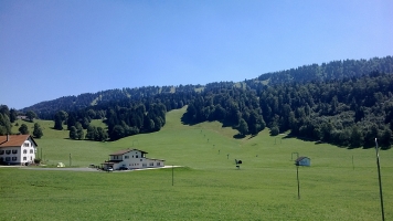 La longue ascension en direction du Chasseral commence, on se croirait dans les Alpes, station de ski, chalets de montagne pourtant on doit être à 1000m d’altitude. Arrivé à quelque km du sommet je suis déjà bien entamé physiquement. Deux choix s’offrent à moi, soit je continue et descend sur Saint Imer soit je fais un détour par le sommet. Je me demande si c’est bien raisonnable de grimper au sommet du Chasseral, sachant qu'il me reste 100km à parcourir. Je croise un pépé local, qui me dit qu’il reste 500m pour 6km mais que là-haut c’est vraiment exceptionnel. Alors que décider ? Ca serra le sommet du Le Chasseral !!!