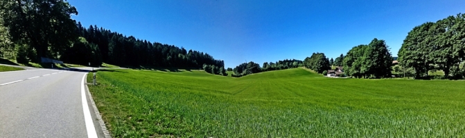 Une route en super état, le ciel bleu, l’herbe verte et des drapeaux suisses un peu partout, voilà le joli tableau de la matinée. Par moment je me fais doubler par une Ferrari ou autre voiture de sport, mais pour le moment je ne regrette pas d’avoir pris ma monture à 2 roues.