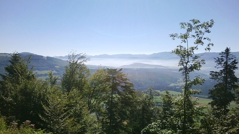 Une fois la frontière passée, je me retrouve en suisse, je continue de monter pour me trouver sur un plateau des Franches Montagne. Direction Saignelégier, la brune est encore présente dans les vallées et la rosée donne des reflets encore plus vert à l’herbe.
