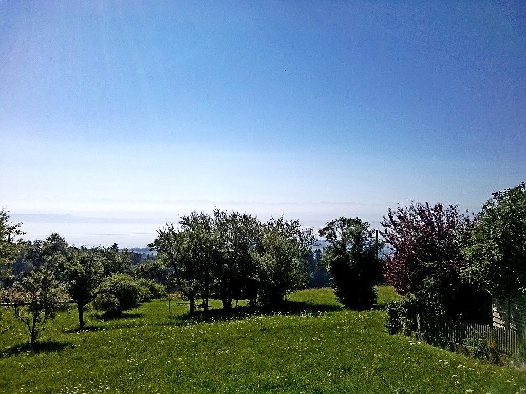 Je me retrouve sur les hauteurs du Lac, et la vue est superbe : le lac brumeux, les alpes en fond. Le tableau est magnifique mais je n’oublie pas autant d’écouter mes sensations, je sens bien que mes jambes sont moyennes et qu’il va falloir gérer pour rentrer à la maison. Je décide de m’arrêter dans une épicerie pour manger un petit sandwich et boire une boisson énergisante.
