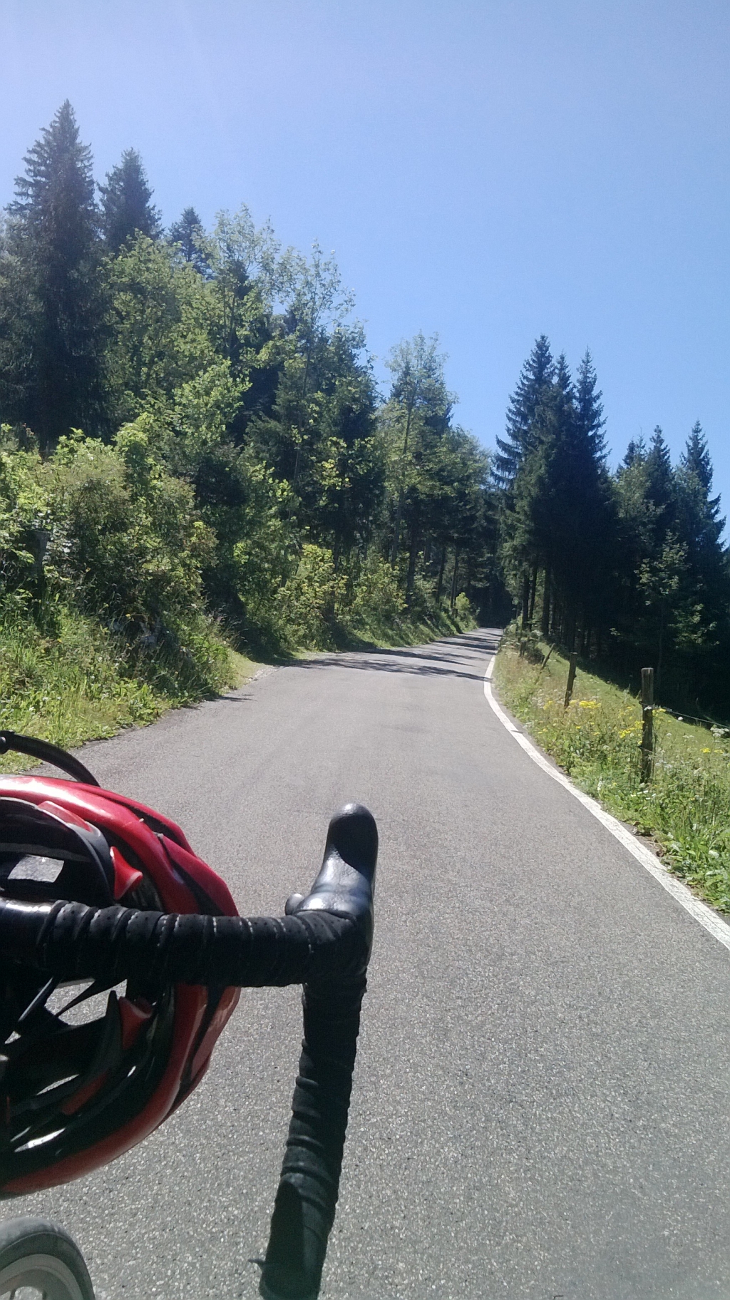 Je n'ai pas regreté, c’est un des cols les plus beaux que j’ai gravit : une petite route pas plus large qu’une voiture en parfait état au milieu des sapins et pâturages. La pente est raide, il me faut m’accrocher.